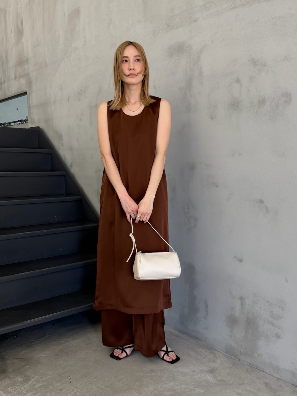 サテンセットアップ🤎 ブラウンの色味も好き🍫 ⚫︎骨格:ナチュラル ⚫︎パーソナルカラー:イエベ春 ⚫︎着用サイズ tops:M〜L bottom:M〜L shoes:22.5〜23.0cm