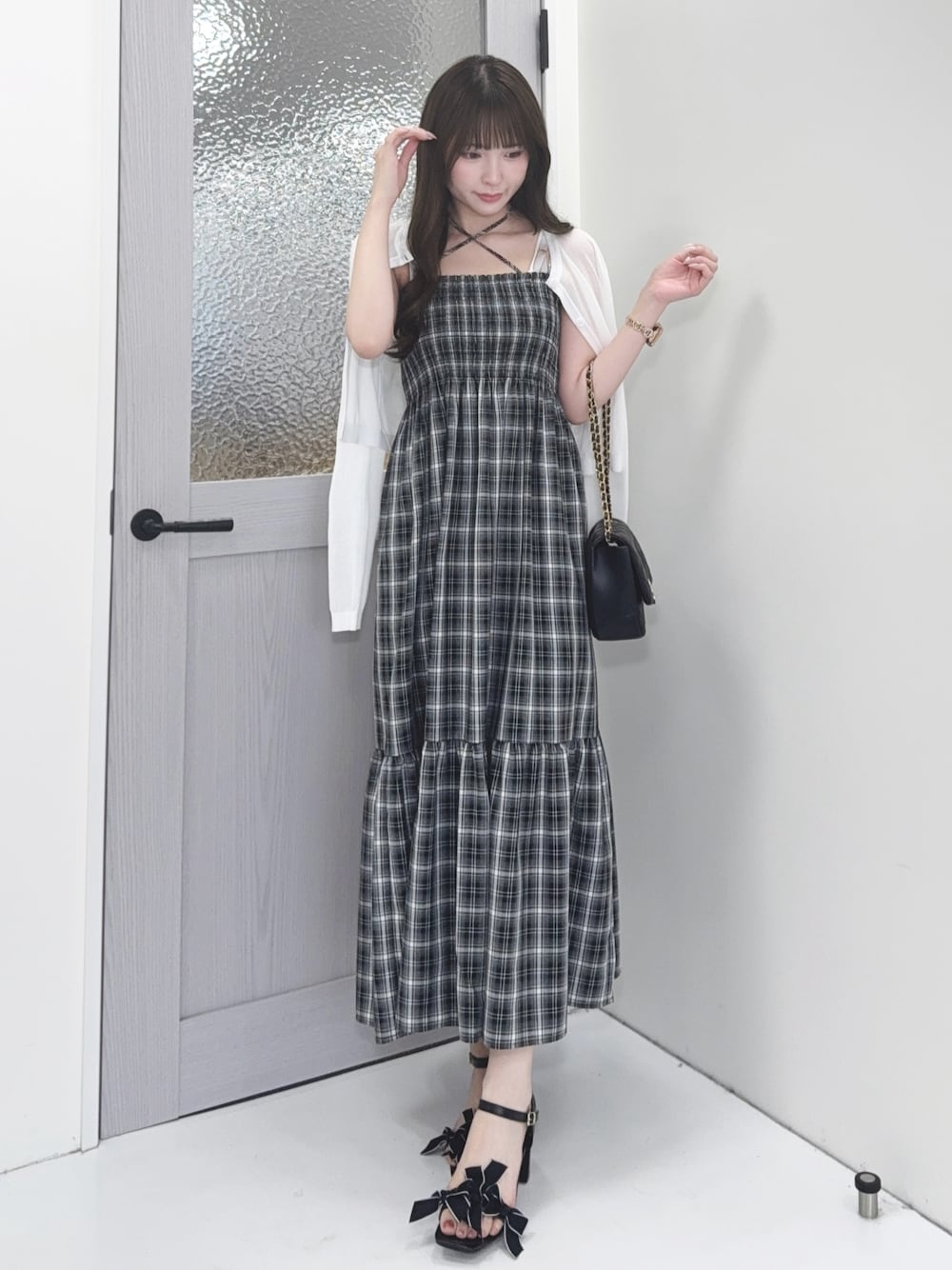 トレンドのチェック柄のワンピース キャミワンピなのでさらっと楽ちんに着こなせます🍀*゜ ホルターネックが今っぽでかわいい♪ 【onepiece】 ワンピースは胸もとがシャーリングになっているので、上半身はほどよいフィット感があります◎ スカート部分はふんわり広がるシルエットがかわいい♡ 取り外し可能なホルターネックが着いてるのでポイントになってオシャレ感が出ます! 【cardigan】 シアーのカーディガンは日焼け対にも冷房対策にも使える便利な一枚🎶 透け感のあるサラッとした素材なので、真夏でも暑苦しく感じません! 胸元のさりげない刺繍が大人かわいい♡ 【bag】 大人気のキルティングショルダーバッグ🖤 ゴールドのエンブレムが高見えします⚜️ コンパクトなサイズ感ですが、ペットボトルがピッタリ横向きではいるので容量もバッチリです👍