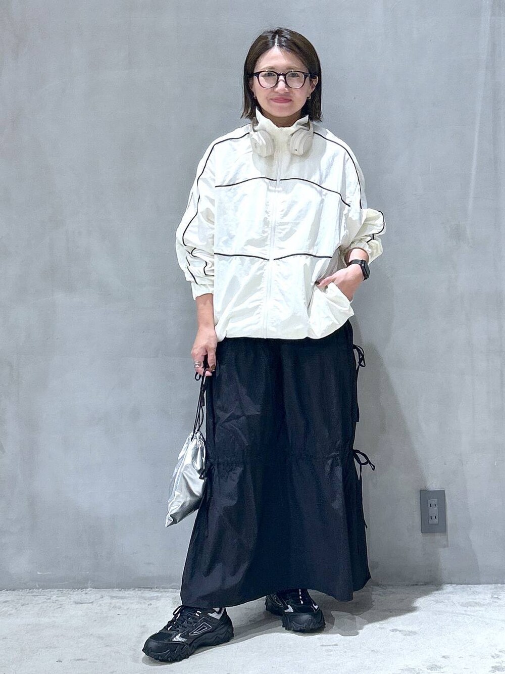 コードラックラインジャケットを、 ドロスとリボンスカートを合わせて 甘辛MIXコーデに🩶 ジャケットは首元まで チャック閉めちゃうのがポイント🤐💓 上下ともサイズF◎