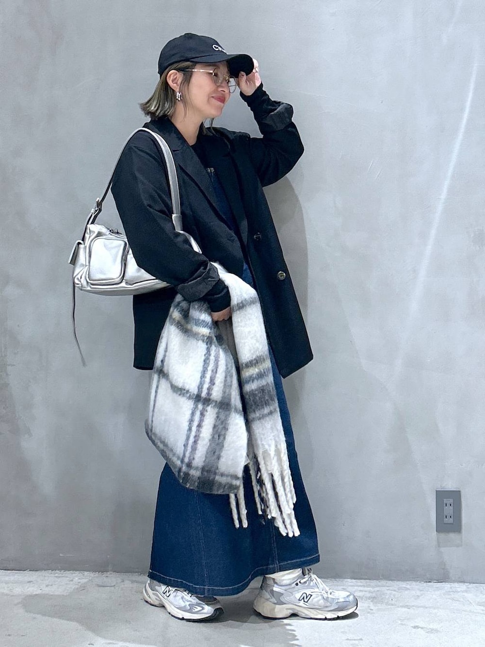 店頭コーデ◎ かっちりしがちな黒のジャケットも、 スニーカーとキャップ合わせするのが ポイント〜🩶🩶🩶 デニムジャンスカは オールシーズン使えちゃうよ🥺💓