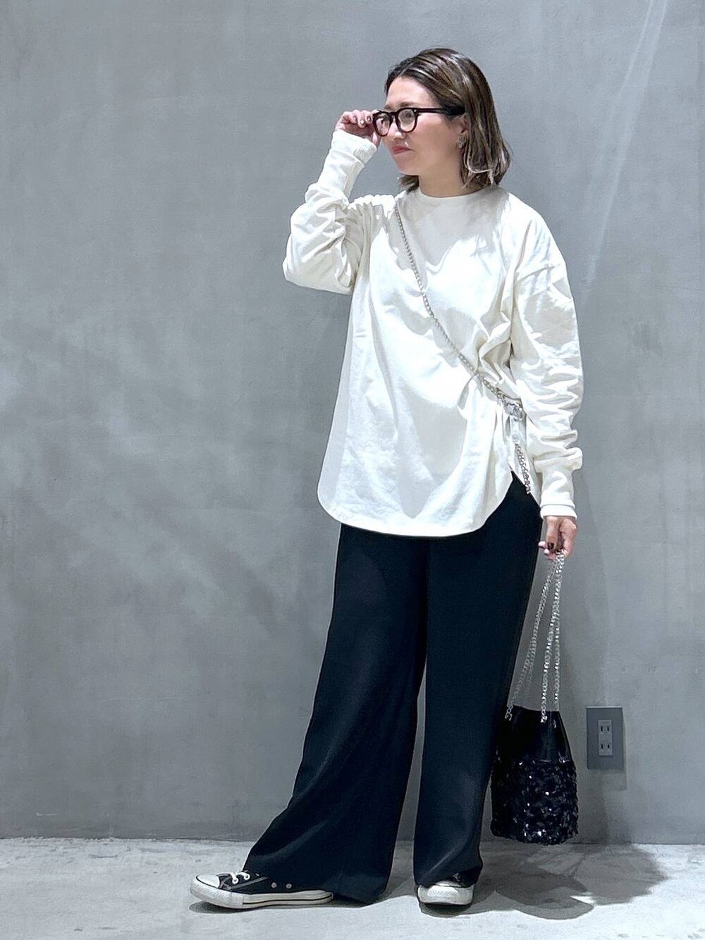 シンプルコーデ◎ ラウンドBIG長袖T シンプルでスタイリングにも取り入れやすいデザインの ロンT。 BIGシルエットがこなれ感もあり、 着丈が長く裾がラウンドヘムなので 1枚でもサマになる1枚です。 袖口にはリブをデザインしニュアンスがつけやすいのもポイントです。 ダブルクロスイージーパンツ◎ ーーー ストレートシルエットのパンツ。 もも回りや腰回りにもゆとりがあり ウエストにはゴムと紐を使用しているので イージーな穿き心地が魅力の1本です。