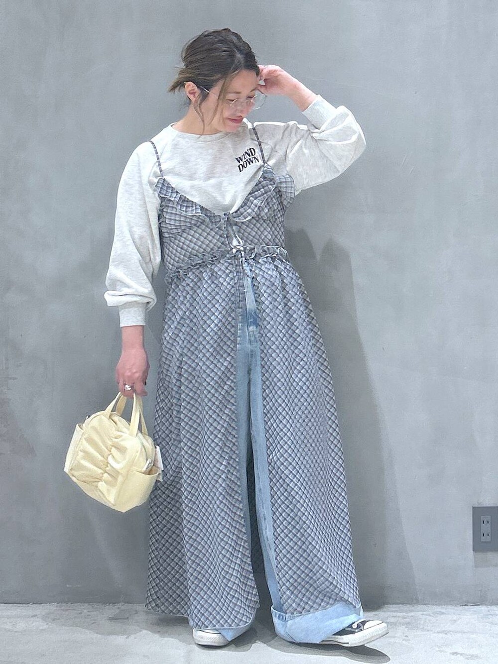ウエストフックデニムパンツ 今回はL着用。 太もも周りはLサイズが良かったので、 でも丈感が長いのでガッツリロールアップしました👖💓 シアーチェックフリルワンピース こちらはデニム合わせが おすすめーーーー💙 腰まわりが気になるので隠しました😎