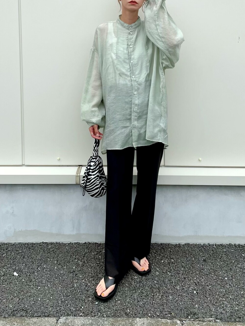 グリーンカラーが爽やかなシアーシャツ🌿 と、美脚になれるスラックス🥺 インスタ@asammy_s