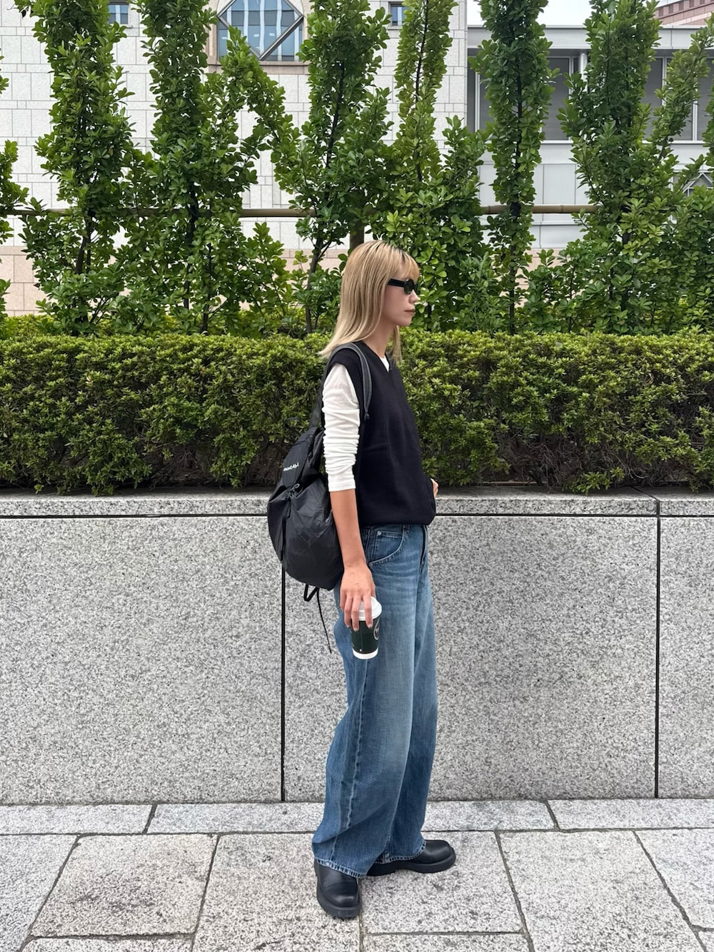 ブラック系のトップス、ブラック系のバッグを着用したレディースの秋コーディネートの1枚目の写真