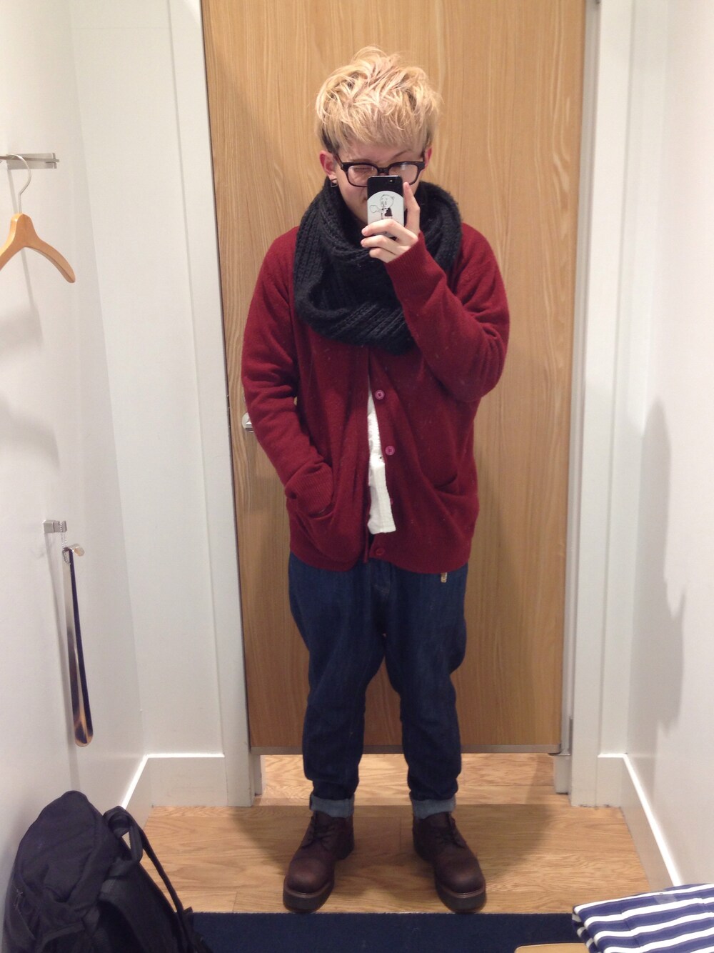 スヌード カーディガン:g.u シャツ:Ikka パンツ:Ne-net シューズ:Dr.Martens 撮影場所:GAPの試着室←