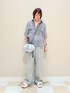 ゆったり羽織やすいストライプシャツにスウェット素材のパンツでカジュアルに。