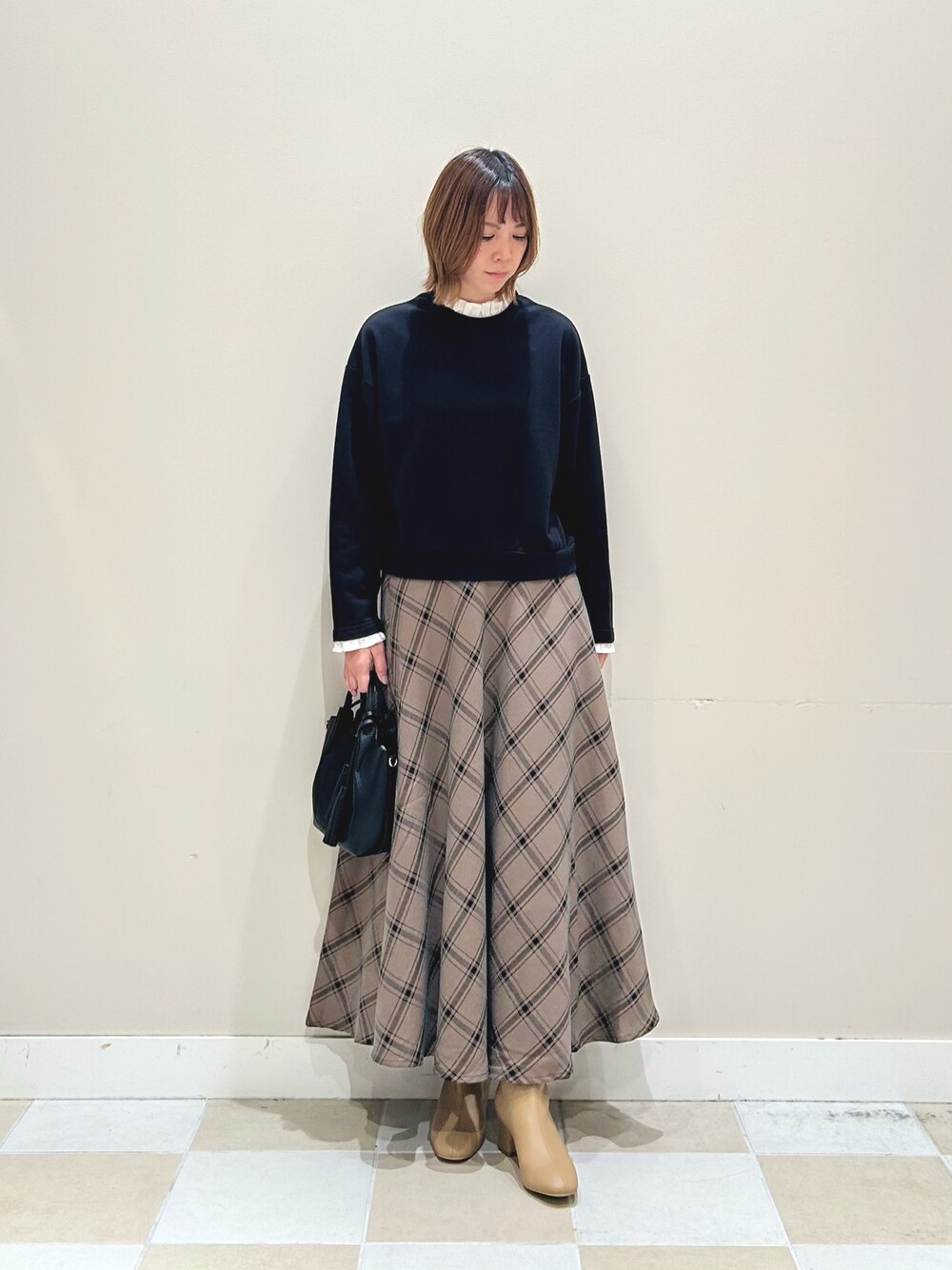 フリルの甘さとスウェット素材のカジュアルのミックス感がいいデザイントップスです! チェックフレアスカートとブーツで秋おすすめのスタイルです。