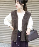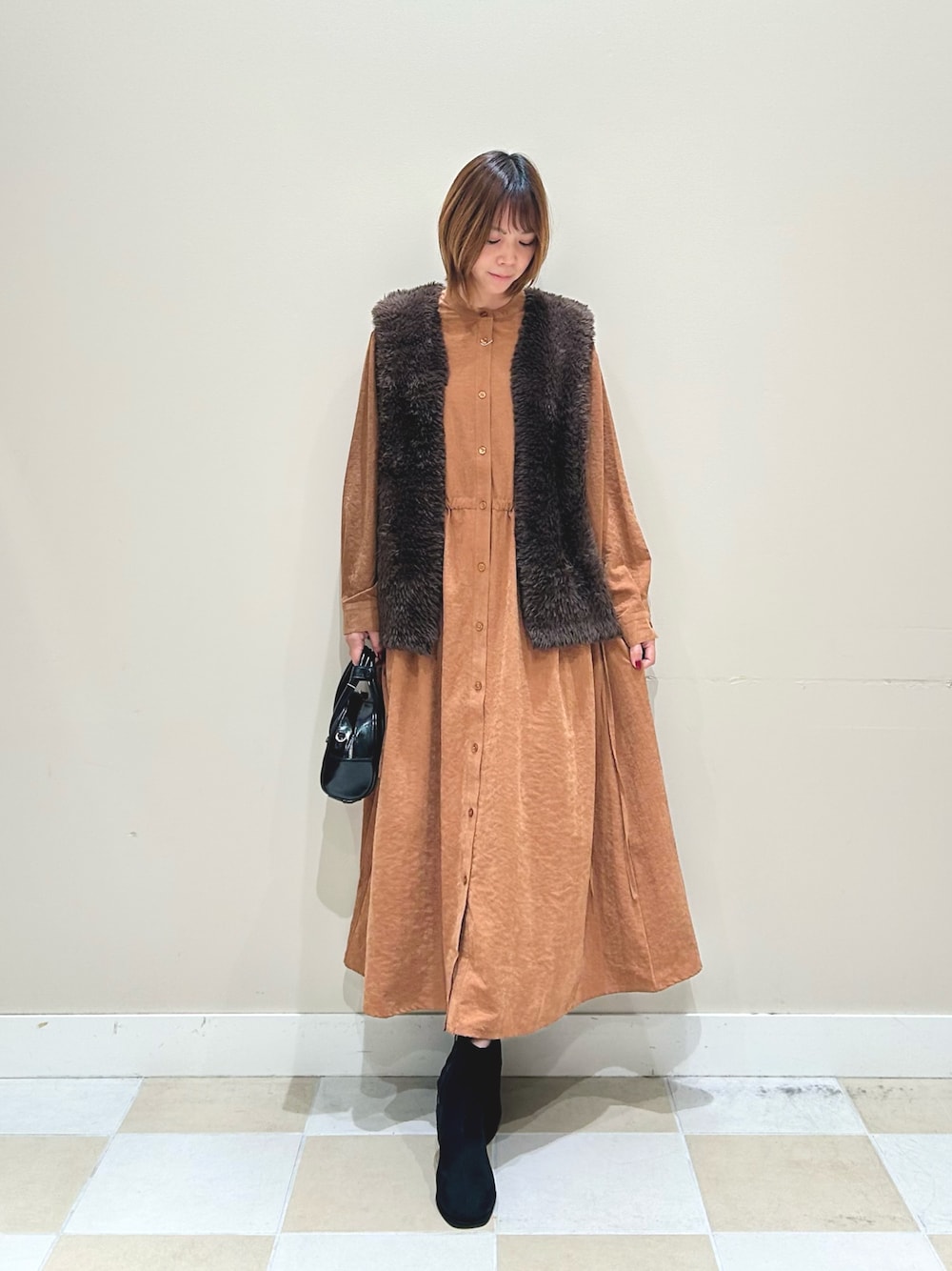 ウエスト調節可能なスエード調のバンドカラーシャツワンピースをファーベスト、ブーツで合わせました! 秋におすすめのお出掛けコーディネートです!