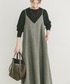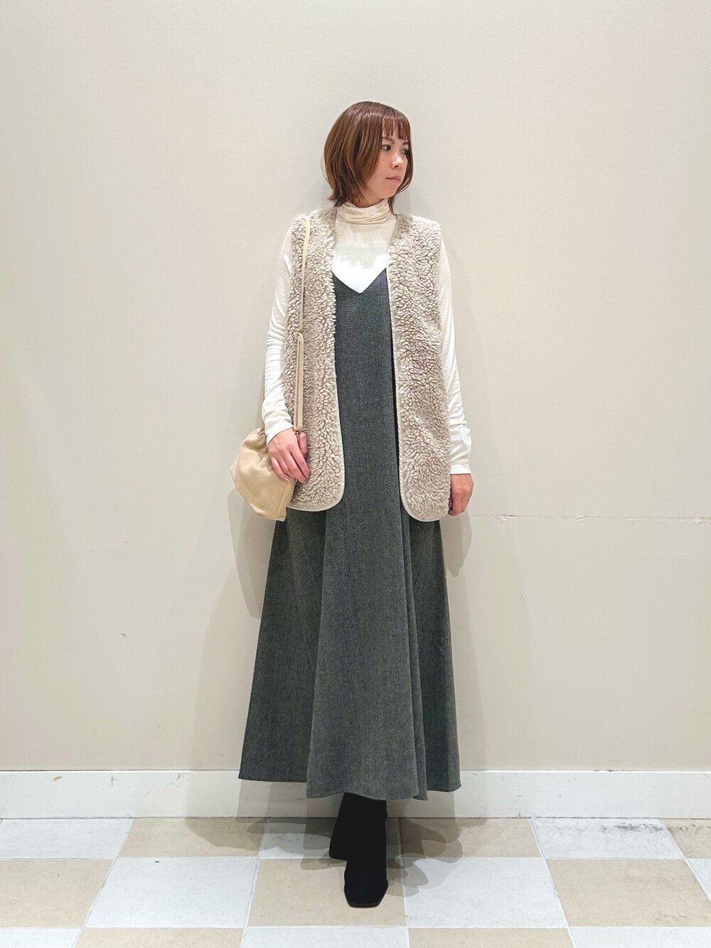リバーシブルで羽織れるボアベストにハイネックのインナー、ウールライクなキャミワンピースで大人可愛いテイストのスタイルに。