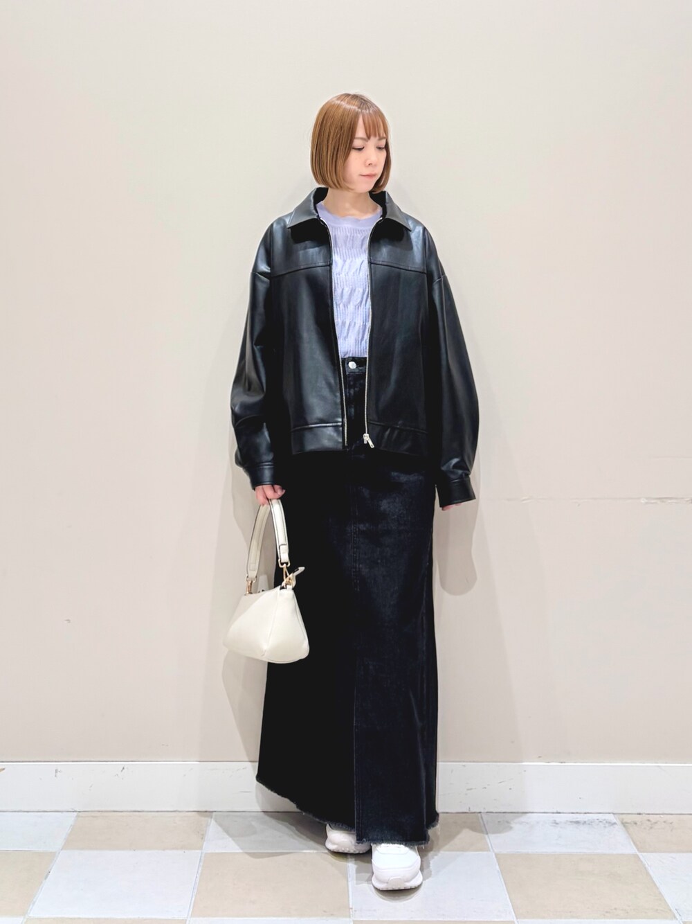 フェイクレザーブルゾンはゆったりしたサイズで重くなりすぎないので、春先のおすすめアウターです!デニムロングスカートに透け感のある軽めのニットをインしたスタイルです。
