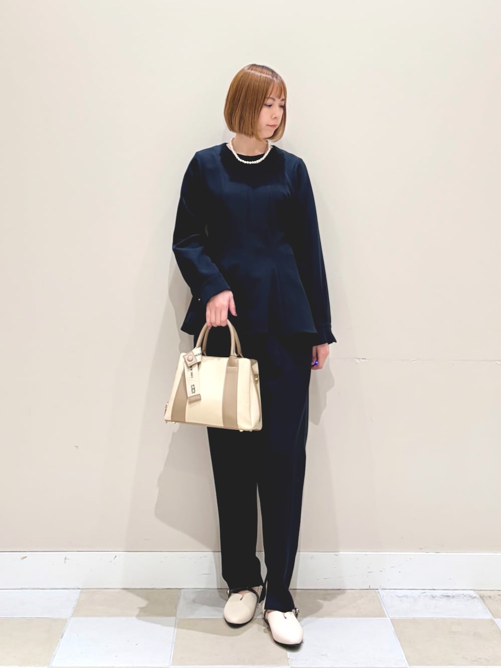 ペプラムブラウス✖️テーパードパンツのセットアップスタイルです! カラーはネイビーで、セレモニースタイルにおすすめです!