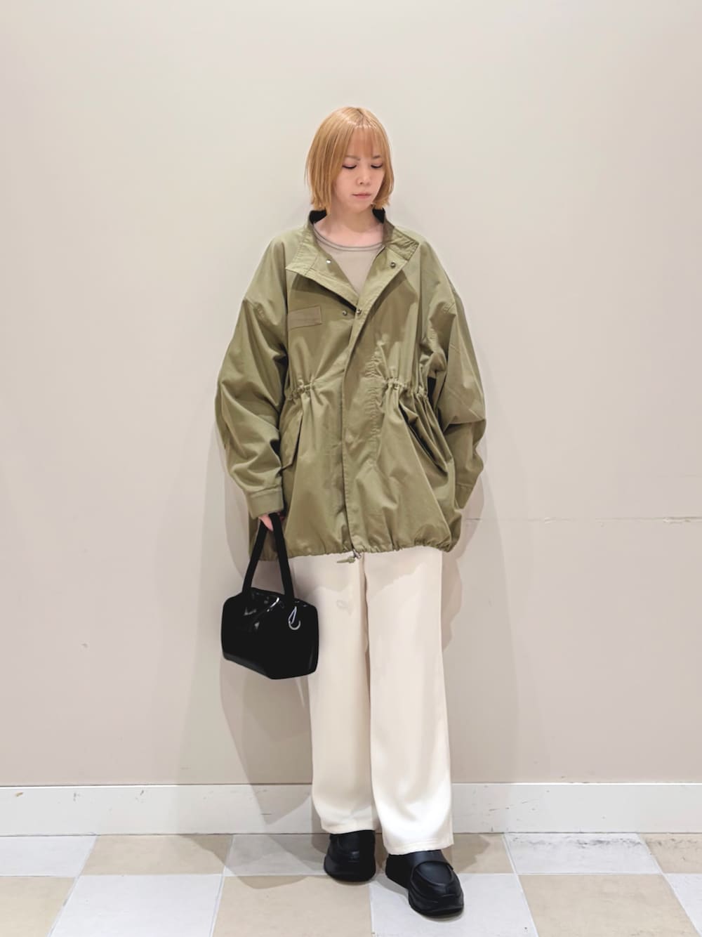 ハードな印象ではなく程よいミリタリーテイストのモッズコートです! ウエストと裾を調節出来るので合わせるアイテムでシルエットを変えて楽しめます。 サテンのセミフレアパンツでクリーンなカジュアルスタイルに◎
