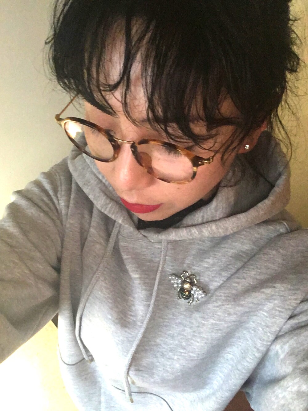 メンズライクなカジュアルすぎるパーカーは、パール付きの蜂🐝ブローチで可愛く。。