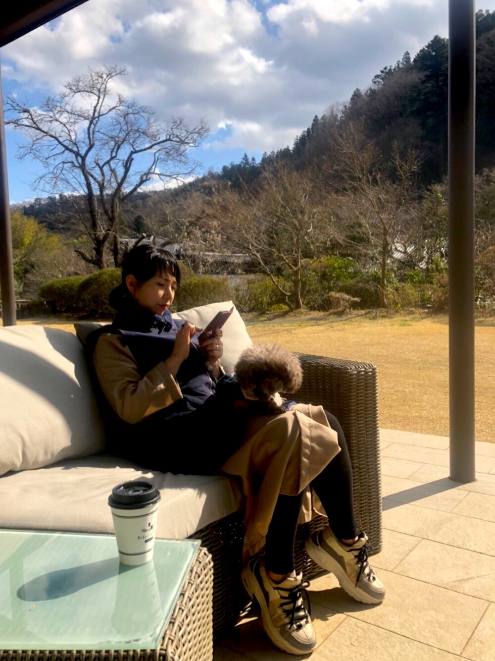 休日に。。 ブラウンワンコと、 ベージュワンピで コーデw