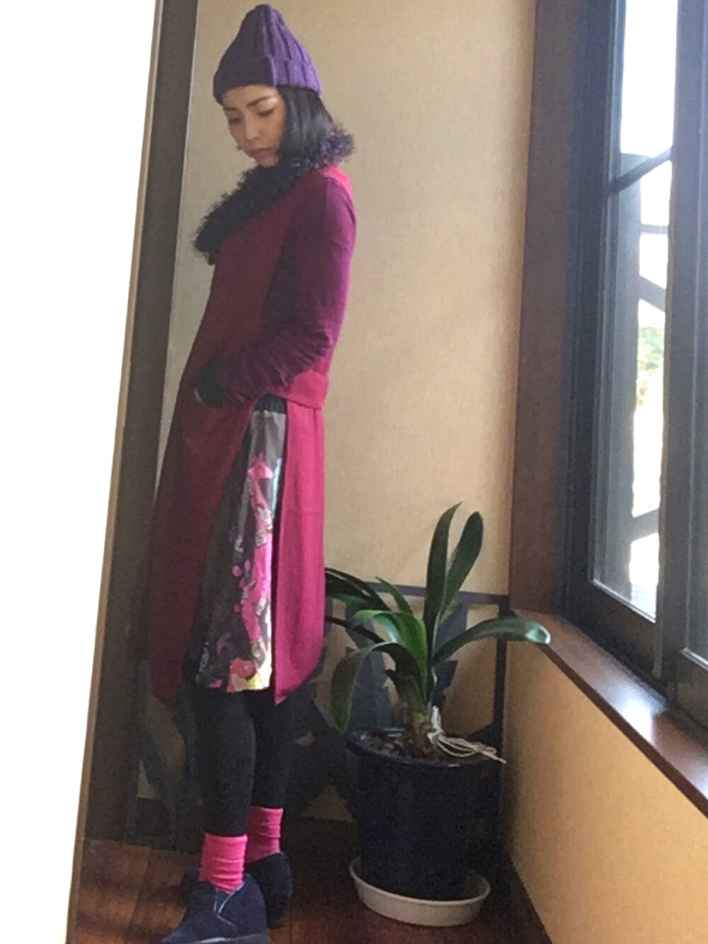 本日の仕事着。。いつも、イイね✨SAVE🎶ありがとうございます😊 そして、フォローしてくださっている皆様💕ありがとうございます😊😊 今日は、色合わせを楽しみました。。 全体的にはムラサキだけど、バーガンディカラーの変わりロングベストがとってもいー感じに調和しました。。 ピンクの靴下も、程よく馴染み。。