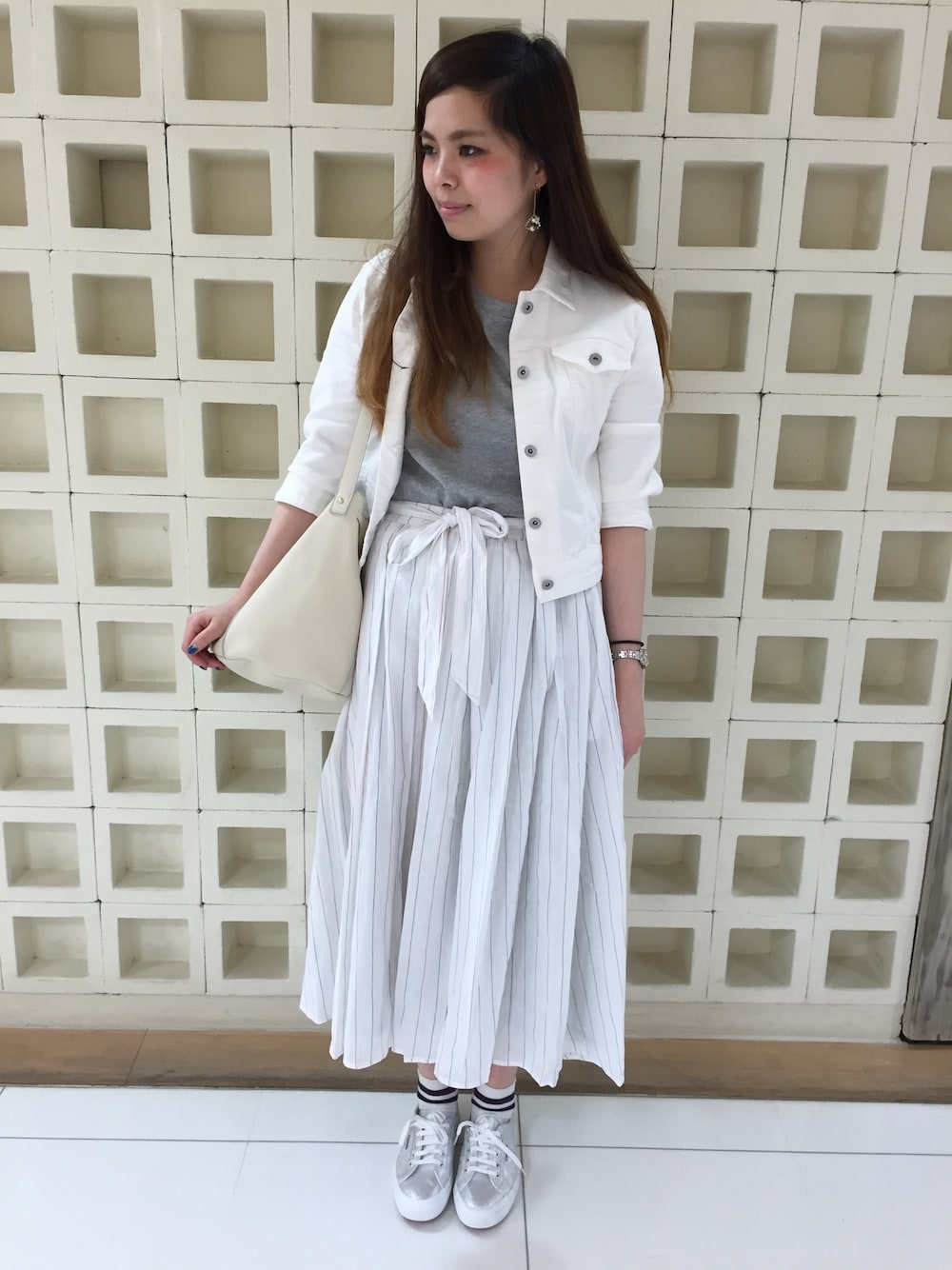 白を基調としたカジュアルコーデです(^O^) スペルガのシルバースニーカーをポイントに、あとはシンプルにまとめました(^ ^)