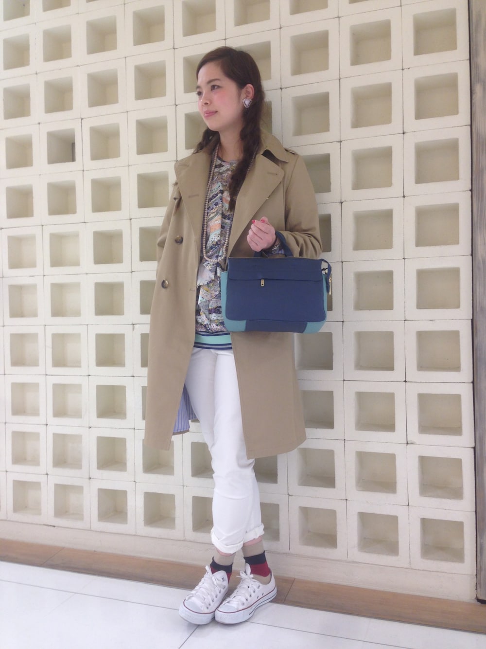 リバティプリントのブラウスを主役にトレンチと白パンでシンプルに合わせました(^○^) 同系色のアクセサリーを合わせて春らしいコーデに仕上げました(^○^)