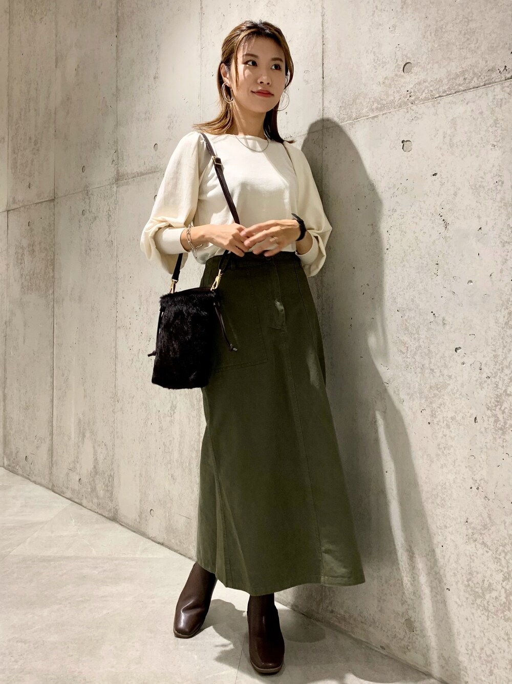 トップス×ボトムスのワンツースタイルをオシャレに叶えるなら、トップスにポイントのあるものがおすすめです。 こちらのニットはシンプルながら、ショルダータックとボリューム袖、長めカフスで女性らしいディテール。 今回は再熱しているサイドゴアショートブーツを合わせて、きれいめカジュアルにコーディネートしました。 【着用感】 ニットは一言で、とっても着やすいです! 首元は詰まりすぎず上品な空き具合で、身幅も程よいゆとりがあります。 おうちでお手入れできるのもgoodポイント! ベイカーチノスカートは36着用。産後骨盤が開いてしまっている私の体型でもちょうど良く着られました。 足首が見える、長すぎない丈です。 ショートブーツは両サイドがゴムになっており、すっと履くことができます。普段24.5の私で38がジャスト。 安定感のある太めヒールです。