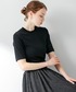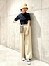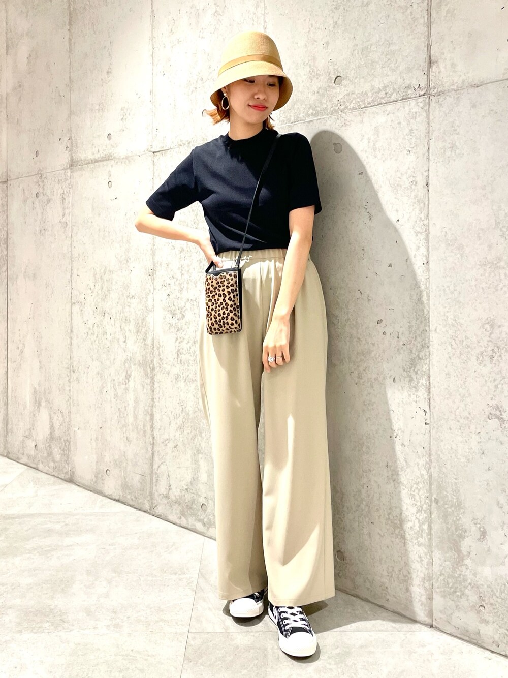 黒のコンパクトニットトップスは、さらっとした薄手のサマーニット。 全然暑くなくて、むしろ接触冷感が嬉しい♡ とろみ素材のイージーパンツと、快適なのにおしゃれな雰囲気に。