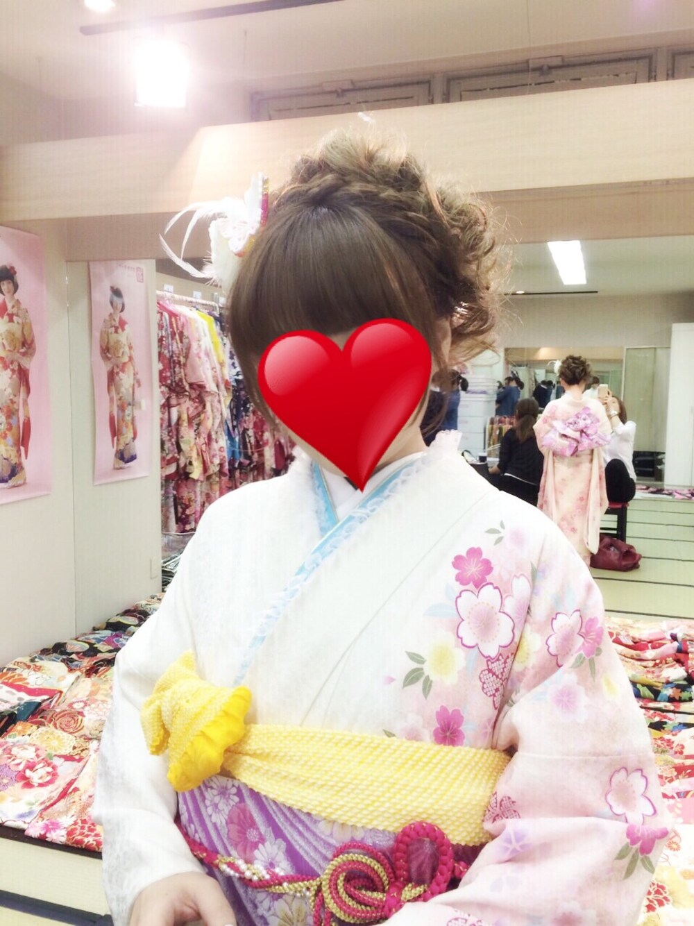 成人しました! 振袖は白地にピンクの桜! ラベンダーの帯とレースがお気に入りです。 髪にはMILKの蝶々バレッタつけた!