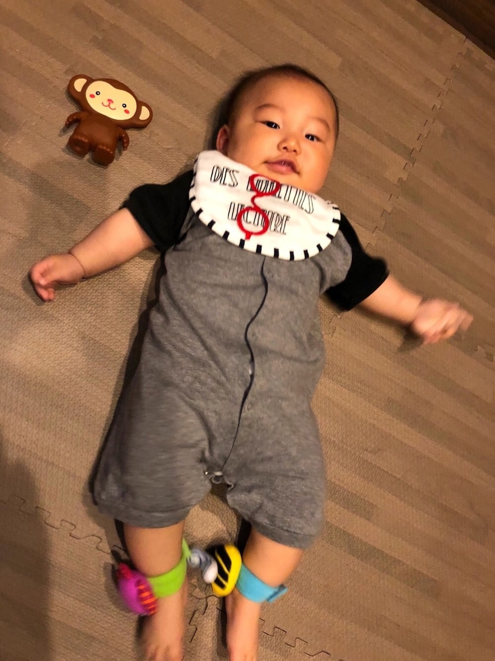 近い月齢の赤ちゃんとmamaが集まる学級に参加☆ 着替えやすい格好で。ロンパースはまたまたがくちゃんのおさがり☺︎こないだもがくちゃんmamaからさらに頂き感謝!!