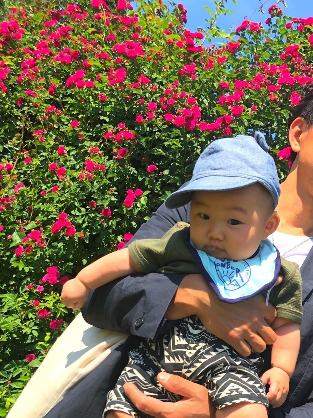 papaとmamaとイングリッシュガーデン🌹 バラがきれいでお天気で気持ち良かった〜♪あさしもずっとごきげんでにこにこでした☺︎ しまむらで買った柄パンかわいい!!