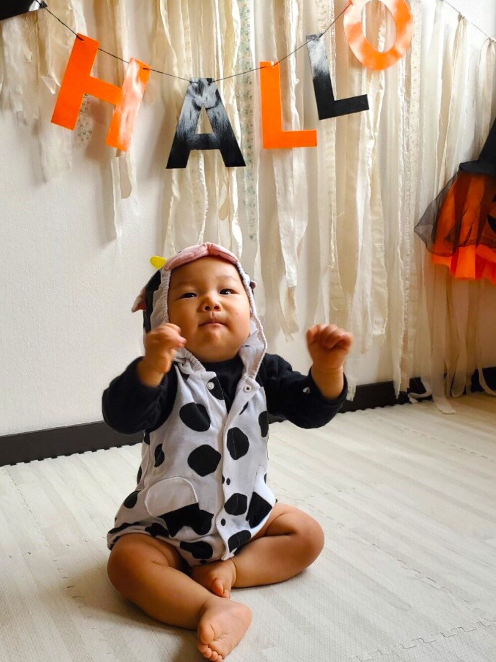 仲良しのお友達とHalloween🎃 あさしは生まれる前に西松屋の底値SALEで買った牛さん🐄 着る機会がなかったから、着れて良かった〜☺︎