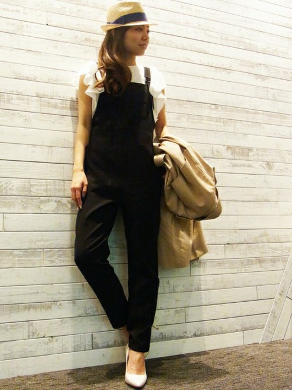 マニッシュになりがちなサロペットを、フリルスリーブのブラウスとハイヒールパンプスで女性らしく仕上げました。 トレンチコートを脱いでもオシャレなスタイルです!