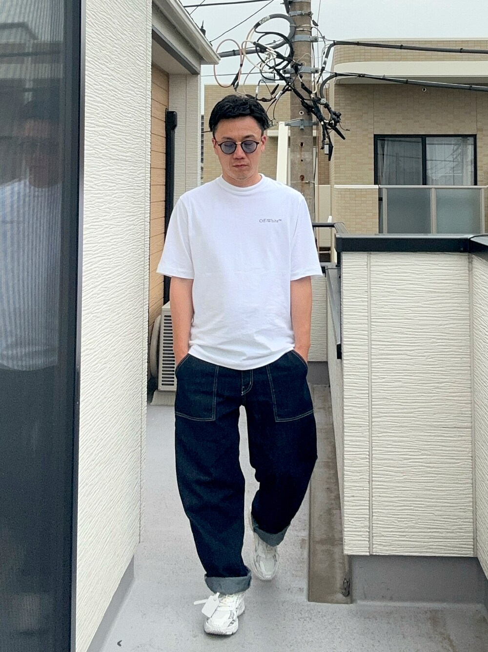 シンプルなスタイルにオフホワイトのスニーカーはインパクトがあり大活躍です☺️