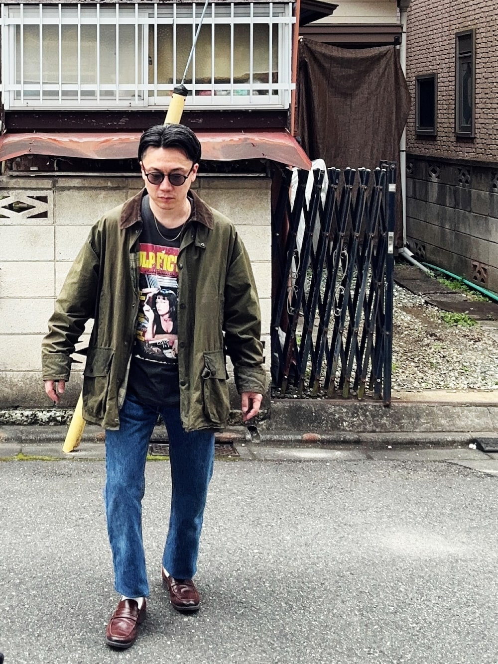 おはようございます☀ PULP FICTIONの映画Tシャツを使ったアメカジを意識したコーデです☺️ ご覧いただきありがとうございます。