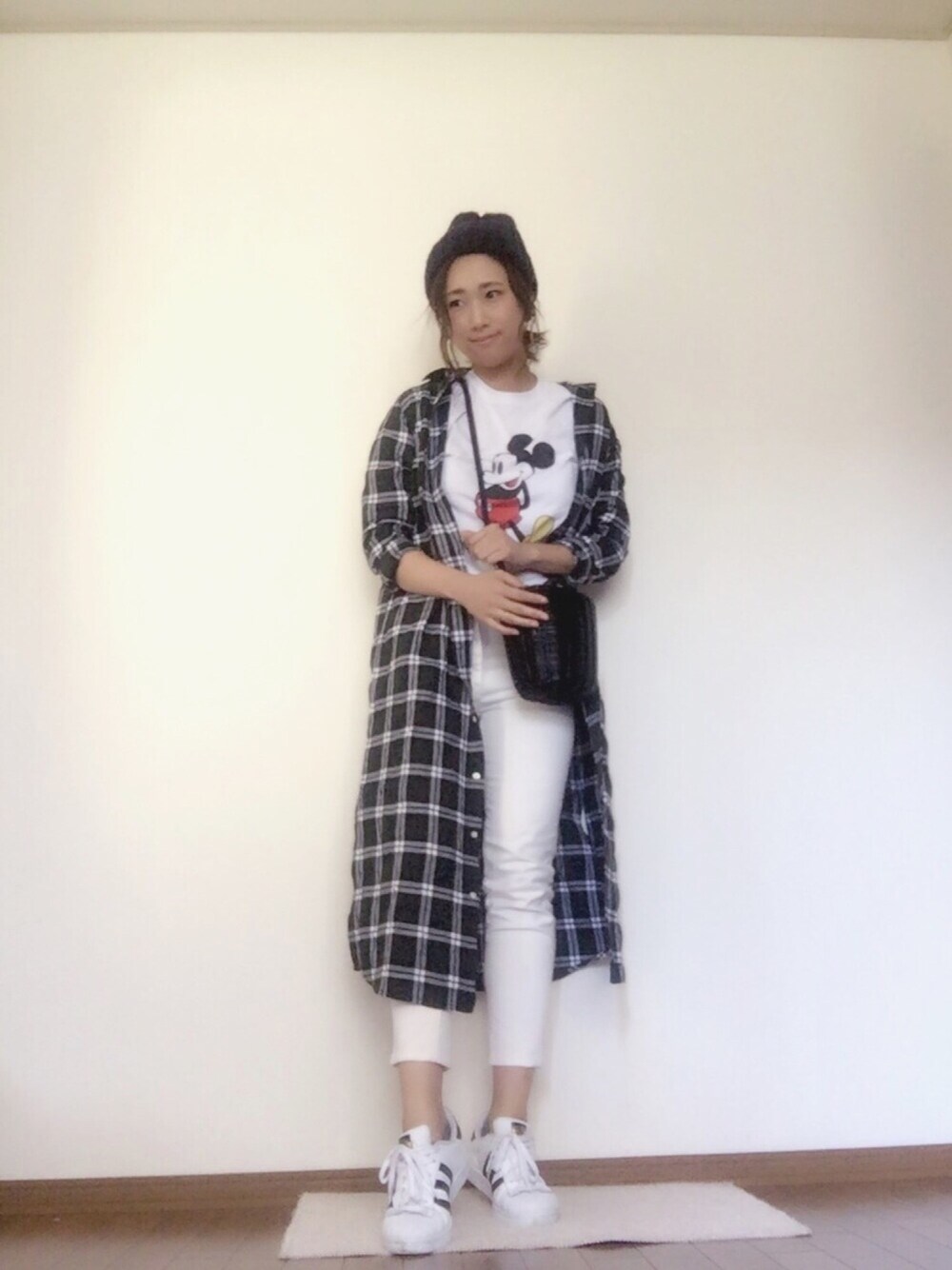 おはようございます。 いつも見てくださりありがとうございます(^^)♬ 今日はTシャツもパンツもホワイト✨ チェックシャツワンピースを羽織りに ニット帽を合わせて カジュアルに。 スナイデルのカゴバッグを斜め掛け〜👜