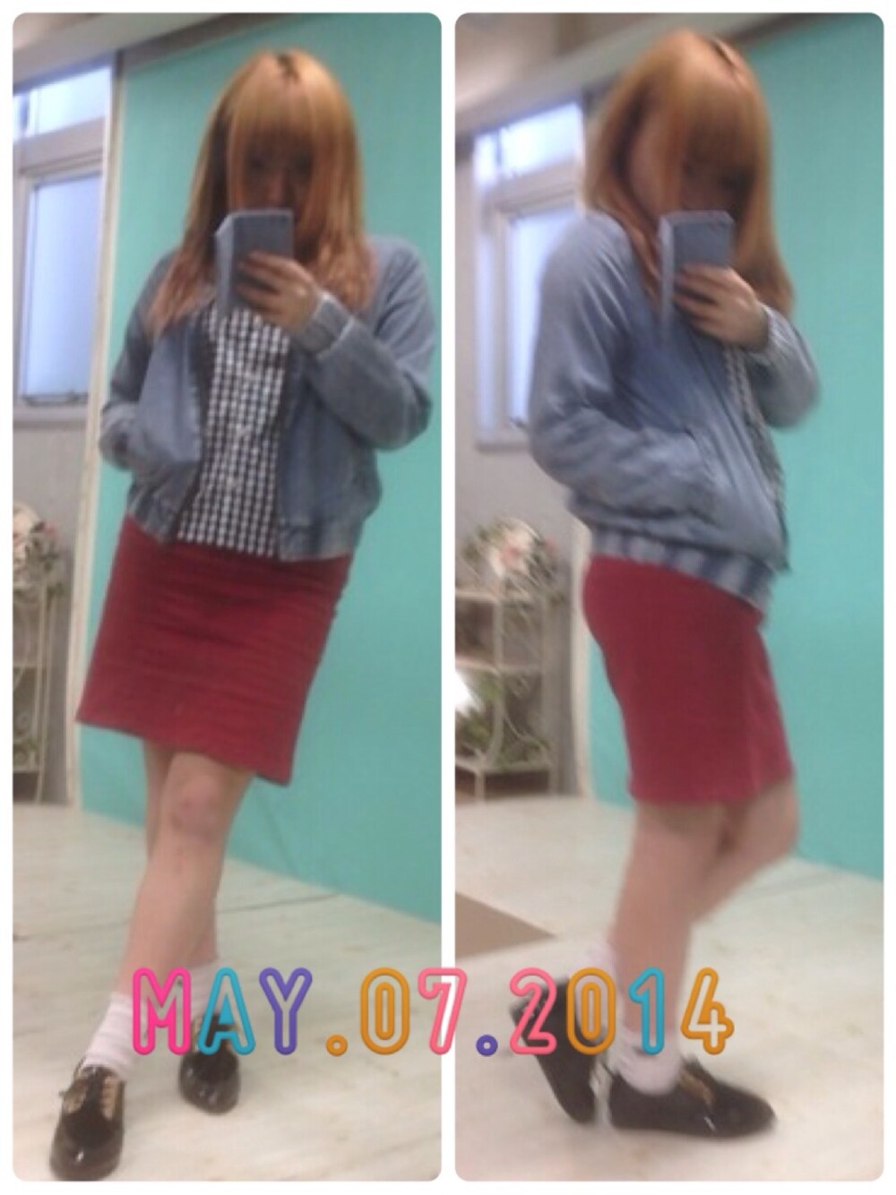 ギンガムチェックシャツ(ハニクロ)1980円 デニムブルゾン(ハニクロ)2980円 タイトスカート