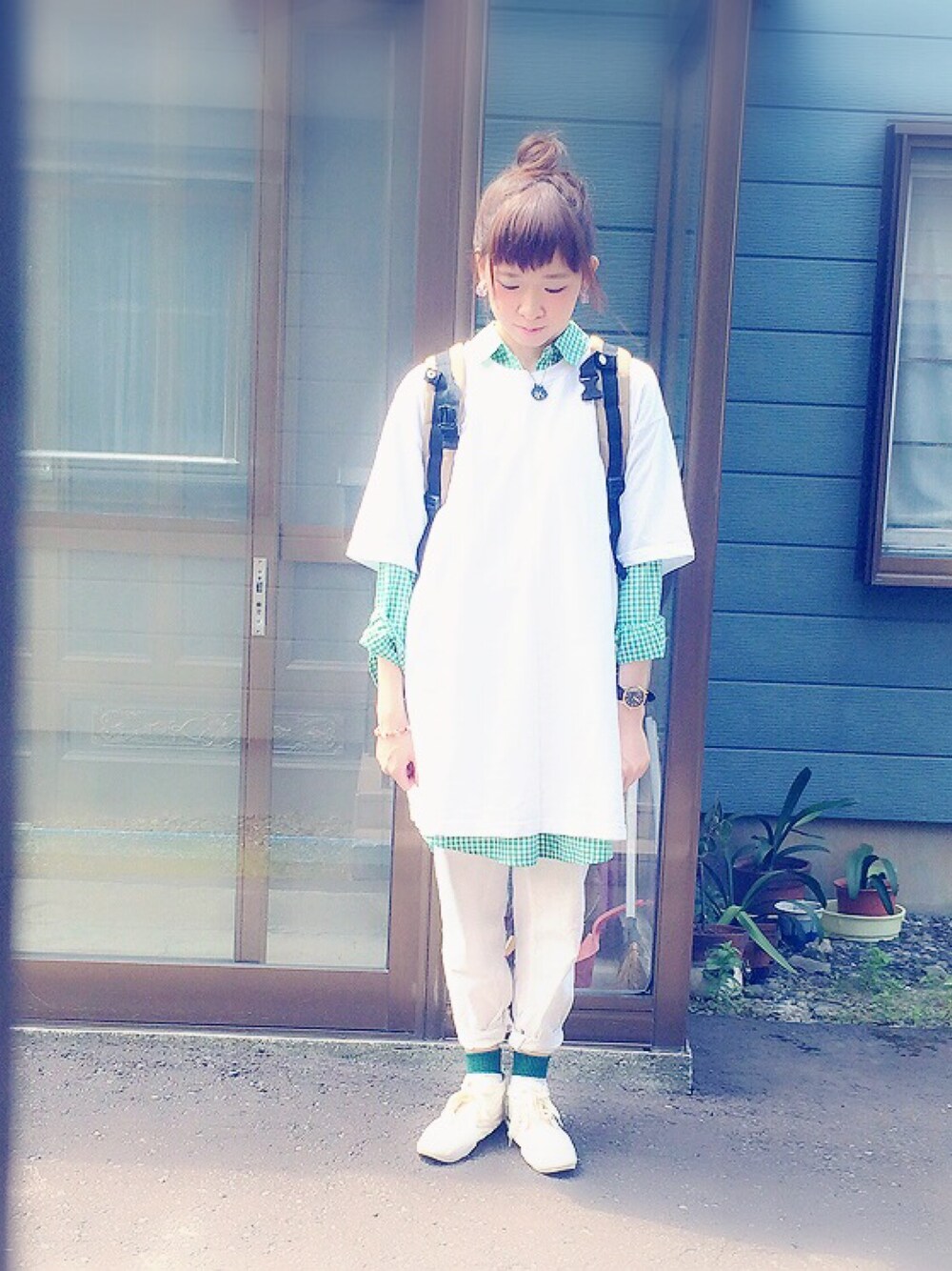 2015 . 06 . 17 夏に近づいてきたコーデ 。 載せようと思って 、 載せてなかったコーデ 。 白 × 緑 緑のシャツワンピは ギンガムチェックで 涼しげ 〜〜(^_^)* ドンホ の Tシャツ は ビッグサイズ で とても重宝してます 。(´-`)💓