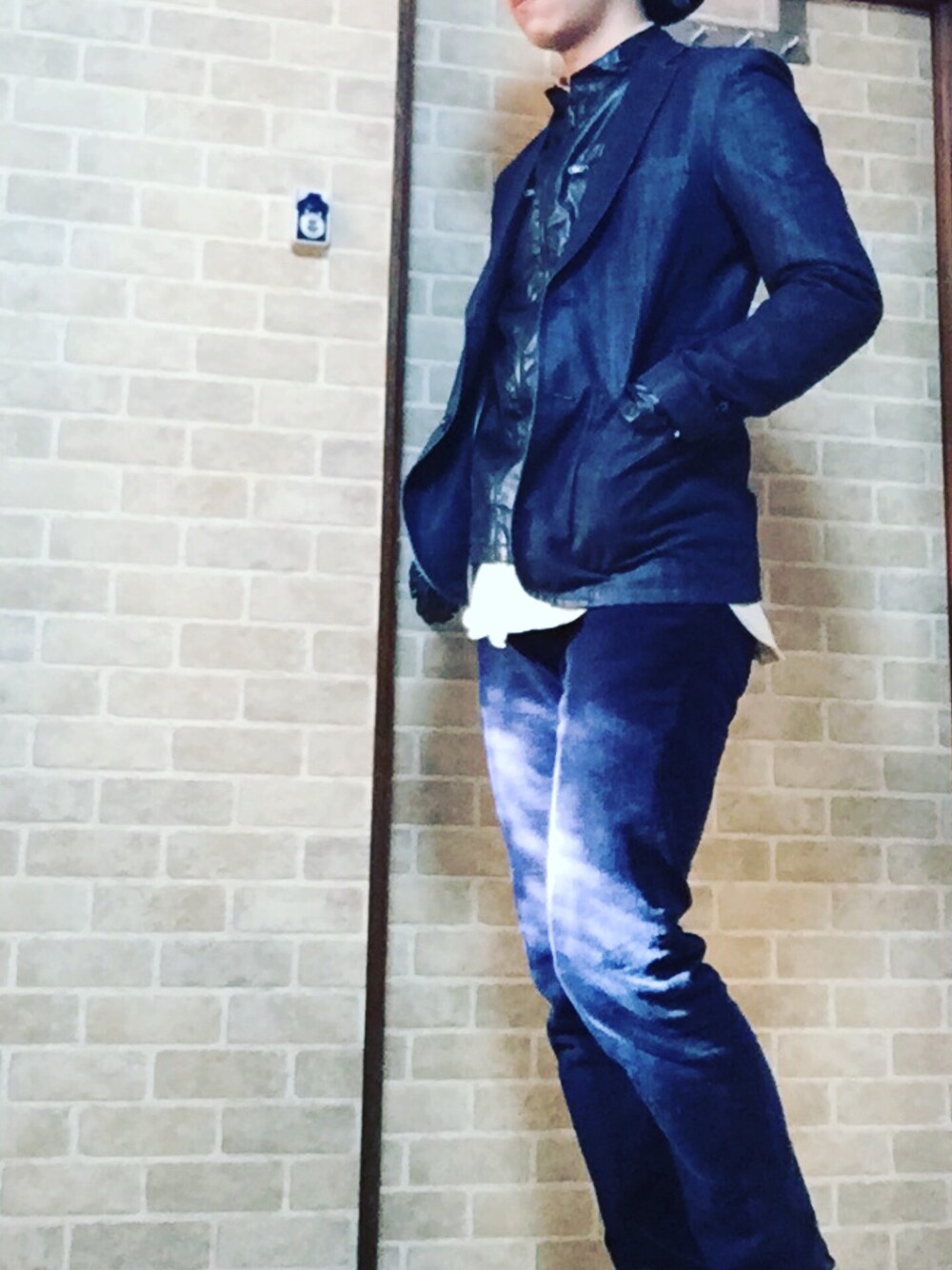 ブラック系のテーラードジャケットを着用したメンズの春コーディネートの1枚目の写真