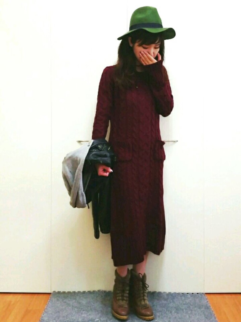 冬をこえてのやっとの秋ですね🍁笑 最近暖かいな~☀ って思ったらまた来週から寒くなりますね😣 本格的な冬になるぞー⛄❄ なのでニットのワンピースです✨ ボルドー色で落ち着いたかんじ! そして体にフィットするかんじもグ~🙌✨ 後ろはスリット入ってて歩きやすいし😊🌼 そこにカーキのハットを合わせて秋っぽく😆🍁 そしてそしてファー付きブーツで すこーし冬に近づけました♪ ジャケットはクールなレザーでしめて✨ もー夜と朝が寒いっ!!! 早く羽毛布団買わないとなー😂❄