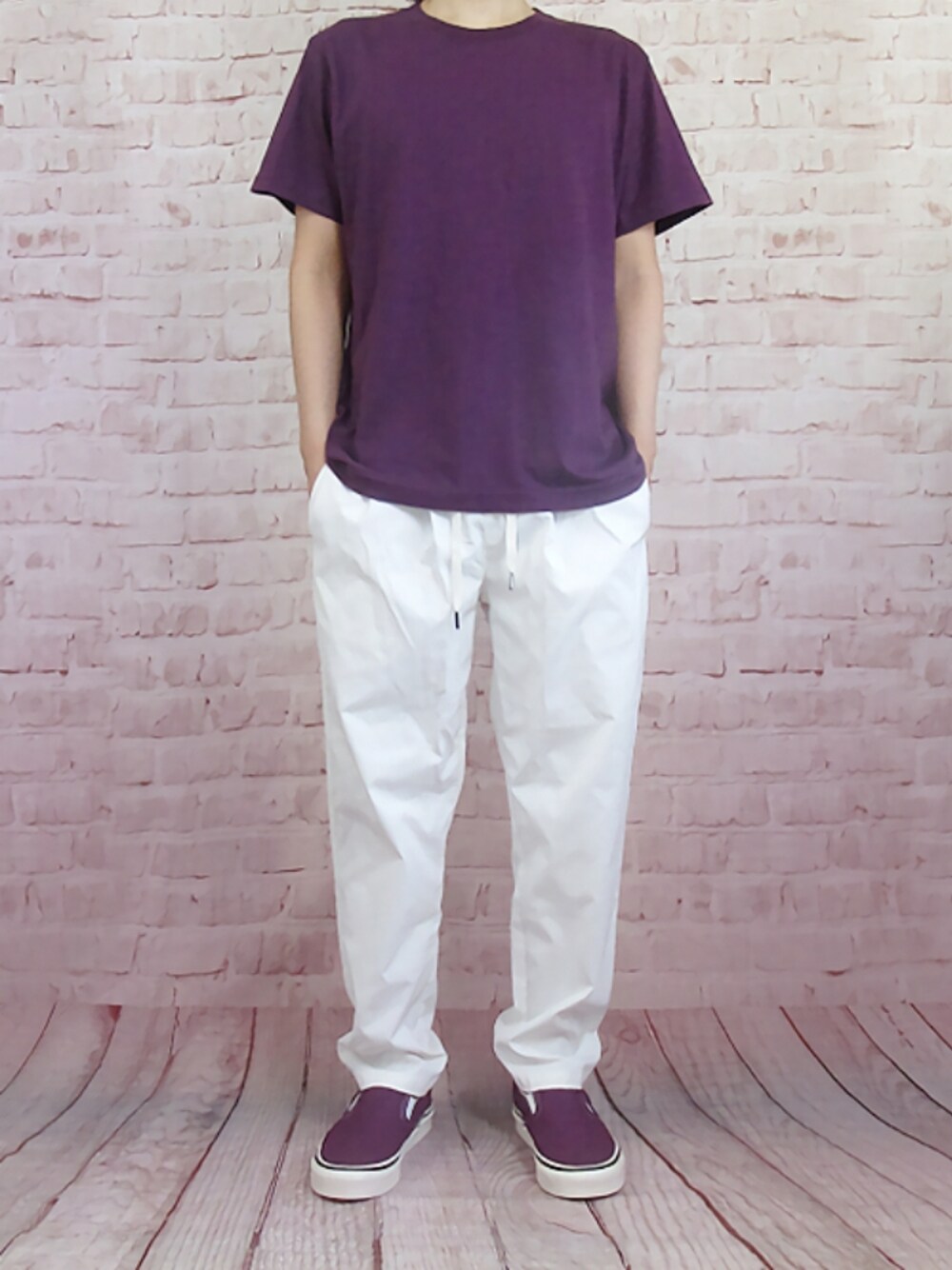 パープル✕ホワイト ホワイトパンツをパープルで挟み込んだだけの至ってシンプルな服装 暗く落ち着いたパープルカラーなので、白を入れて涼しさを出しました。