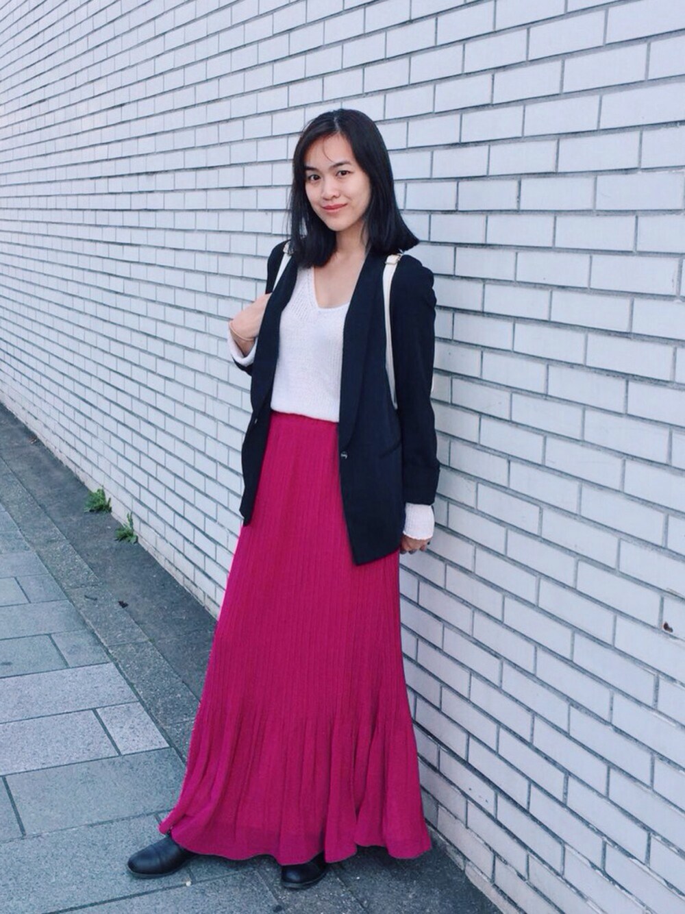 B&w everything with a pop of colour. Pair a lightweight blazer with a feminine flowy maxi skirt.