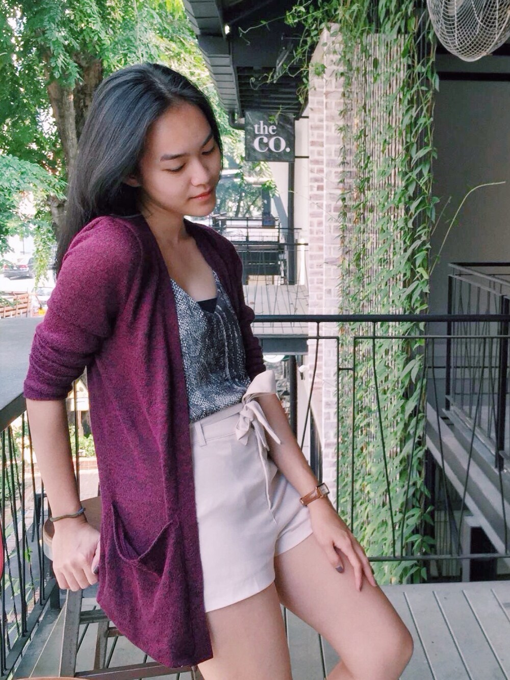 Toning down a fancy top with loose cardigan and high waisted shorts for casual vibes
