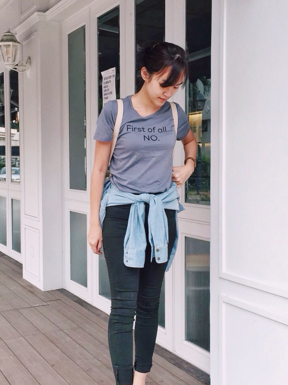 Colored high waisted denim instead of the usual black makes an outfit more interesting