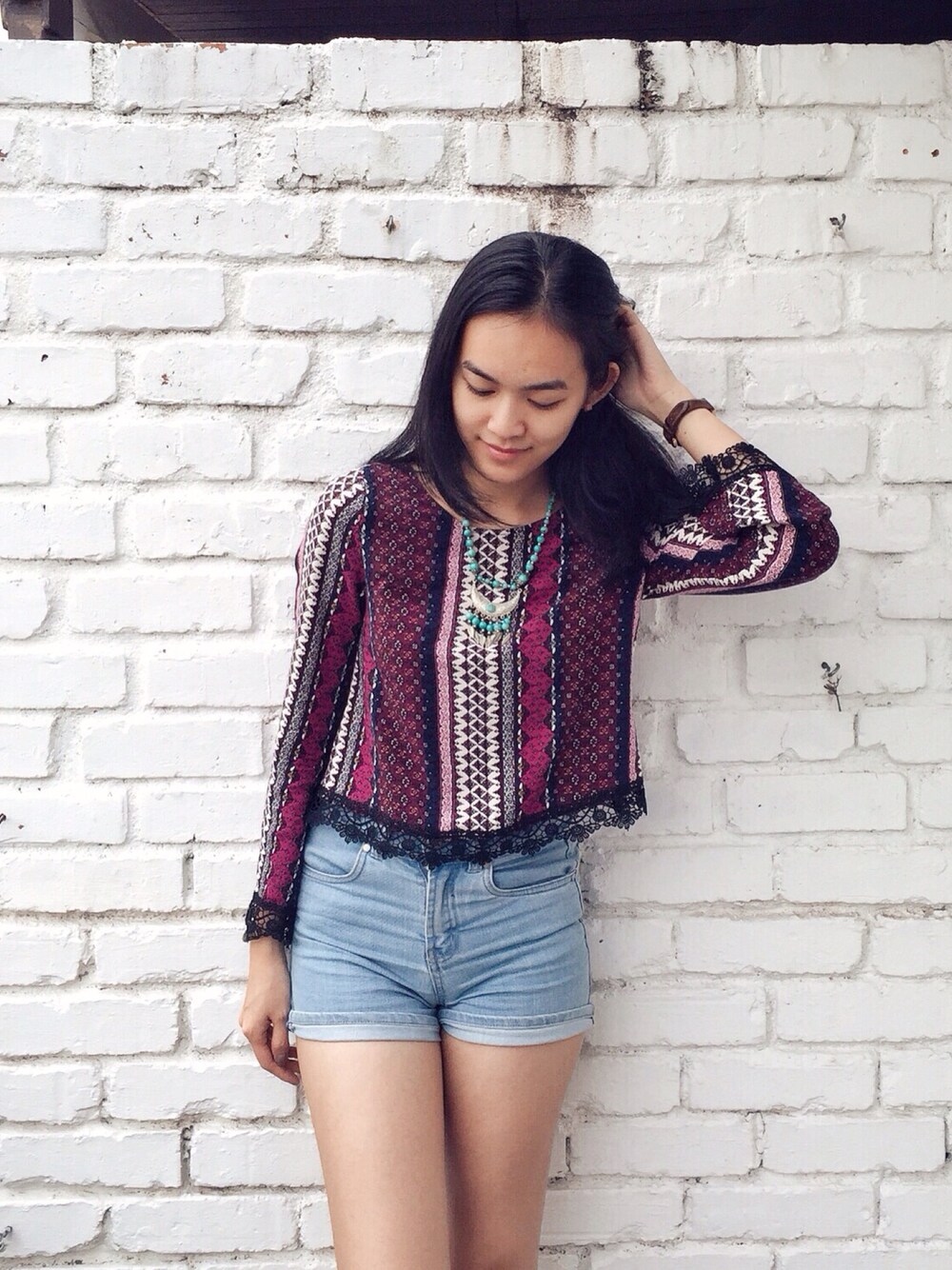 レッド系のその他トップス、ブルー系のその他パンツを着用したレディースの春コーディネートの1枚目の写真