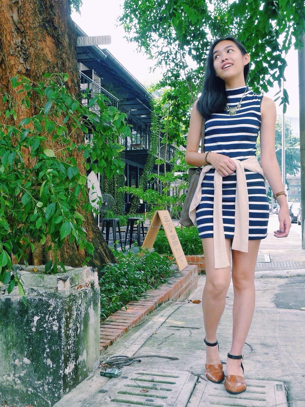 Breaking up the horizontal stripes with a cardigan