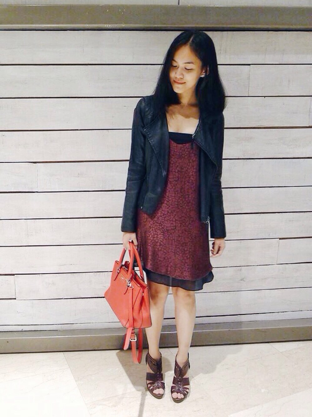 レッド系のドレスを着用したレディースの春コーディネートの1枚目の写真