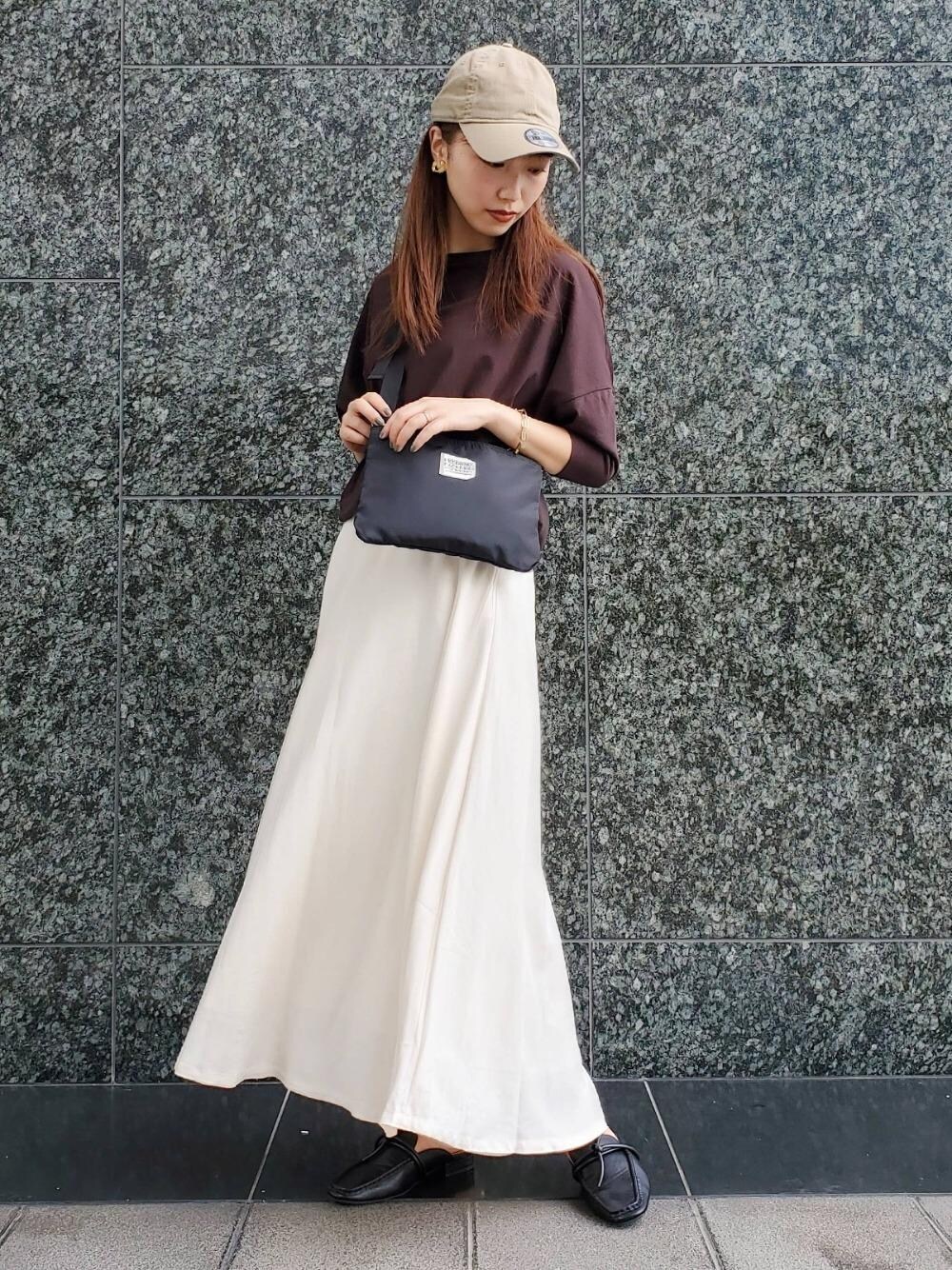 まだまだ暑さの残る9月には、秋ならではのこっくりブラウンのTシャツに、オフホワイトのスカートを合わせ、秋を取り入れつつ重たくならないようにしました。キャップとサコッシュでカジュアルなのに、女っぽさも忘れない組み合わせです。(サイズ:上下ともフリーサイズ)