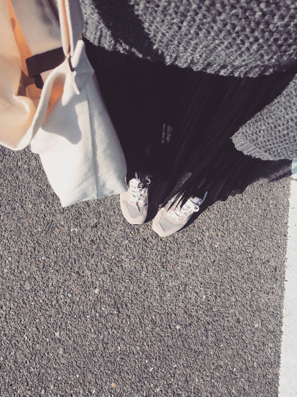 コートいらずの暖かい日のコーデ。このチュールスカートはボリュームもあまりなく、大人っぽく着られるのが好き♡⃛