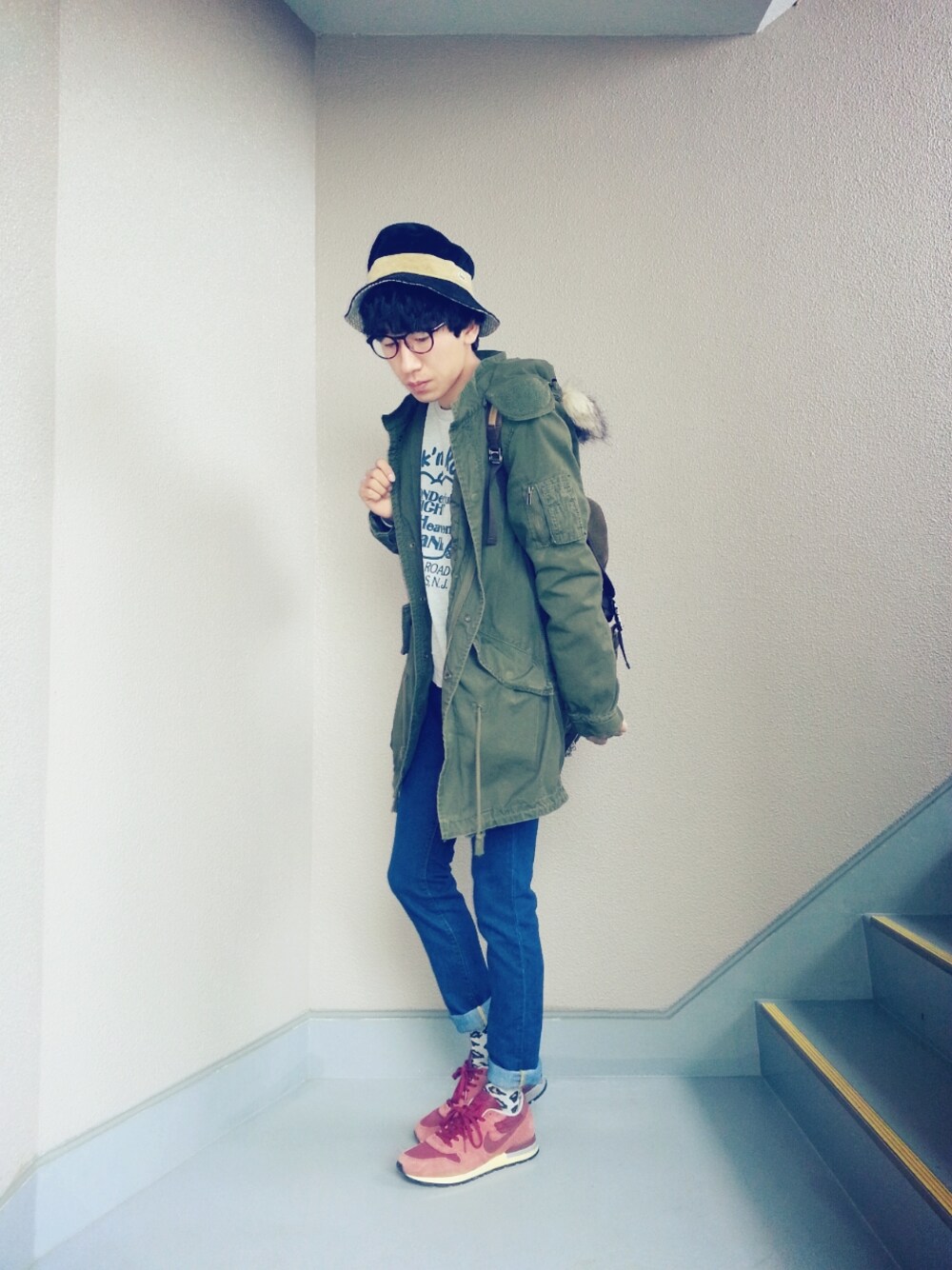 この前使ったモッズコート着まわしです 久しぶりのバゲットハット 赤のNikeでワンポイント