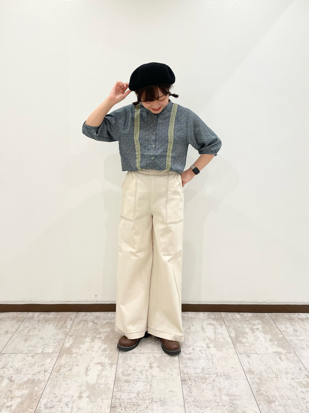 ご覧頂きありがとうございます🎐 ┈┈┈┈┈┈┈┈┈┈ レトロな雰囲気のブラウスに カジュアルなワイドパンツを合わせたコーデです🕰´- ブラウスはサラサラ素材、パンツはストレッチ素材なので 楽に涼しく着ることができます❕ ┈┈┈┈┈┈┈┈┈┈