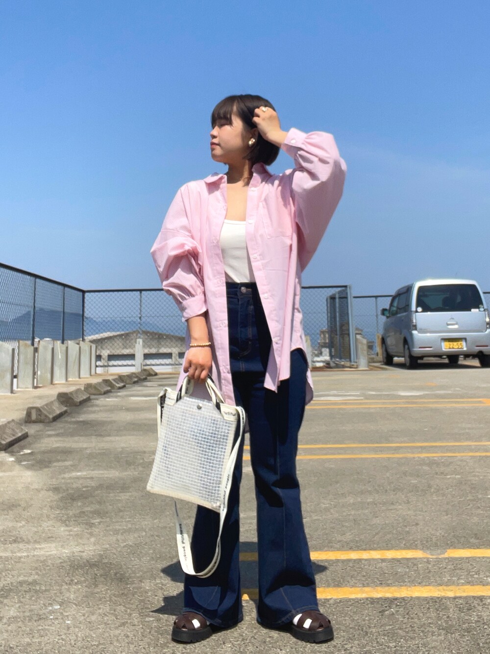 ご覧いただき、ありがとうございます🌸 髪 切りました☀️ ぱつっとボブに! 光に当たると透明感出てかわです🌷 やっと見つけたピンクのストライプシャツ💗 今日はカジュアルに!