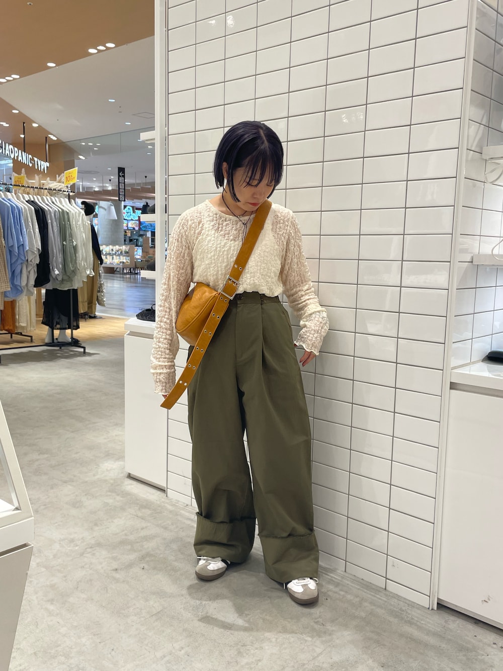 レーストップスは、二の腕周りがゆったりしているので楽ちんです!一枚で着られるので今の時期に大活躍しています✨ パンツはSサイズで、丈感は長めです! 厚底の靴と合わせる方、ずるっと履きたい方におすすめ🌟