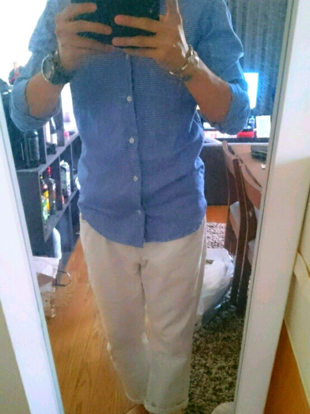 ◆シンプルコーデ◆ 上から ・シャツ/BEAMS/格子柄ブルー ・腕時計/adidas/ブラック&ゴールド ・バングル/SHIPS/ゴールド ・バングル/an+u/ねじりシルバー ・バングル/okiraku/10mmゴールド ・チノパン/GU/アンクルホワイト ・靴下/ユニクロ/ベリーショート ご参考までに(*^^*)