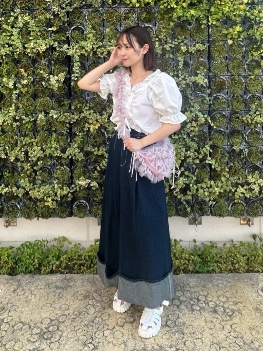 フリルとリボンのブラウス×デニムスカート合わせが女の子らしい、夏の爽やかガーリーコーデ🍹♡ instagram→@asknowasplus
